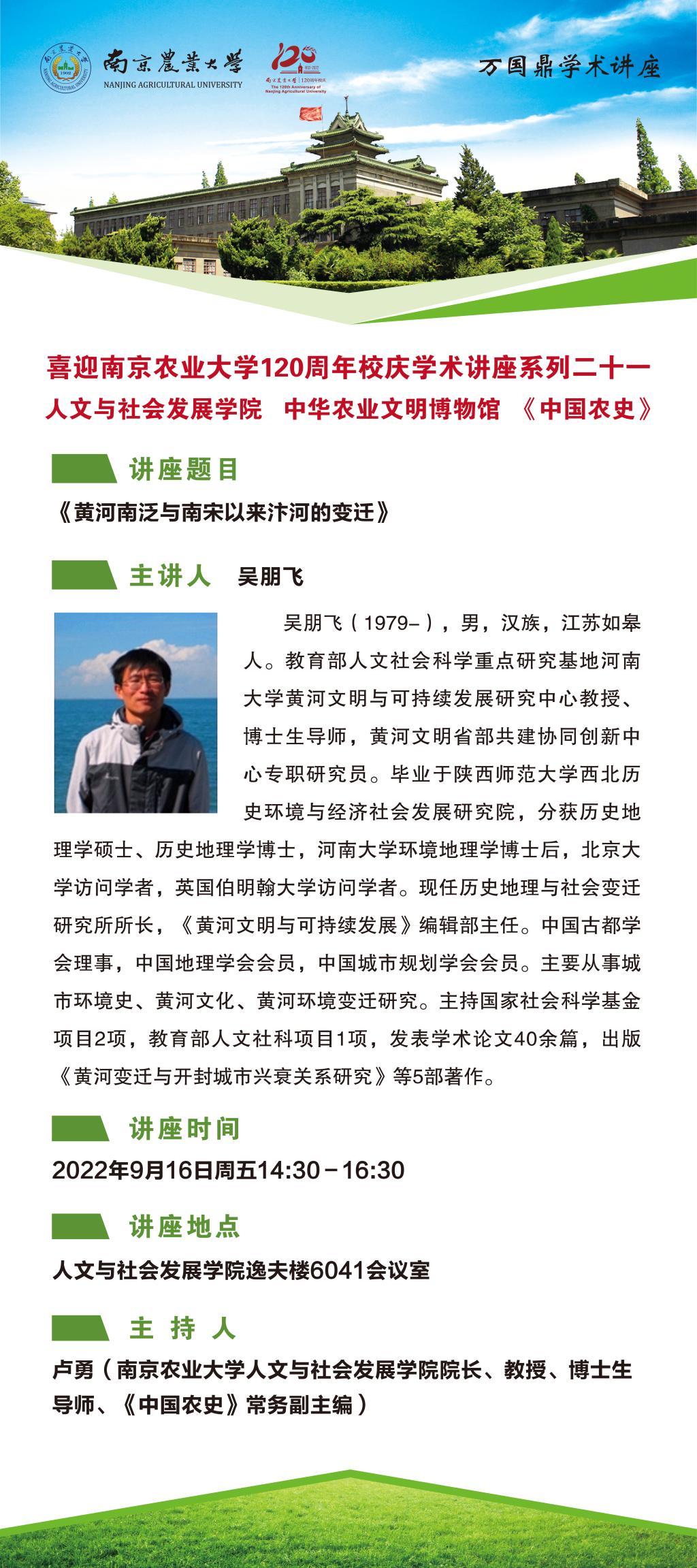万国鼎学术讲座主讲人:吴朋飞(1979-),男,汉族,江苏如皋人。教育部人文社会科学重点研究基地河南大学黄河文明与可持续发展研究中心教授、博士生导师,黄河文明省部共建协同创新中心专职研究员。毕业于陕西师范大学西北历史环境与经济社会发展研究院,分获历史地理学硕士、历史地理学博士,河南大学环境地理学博士后,北京大学访问学者,英国伯明翰大学访问学者。现任历史地理与社会变迁研究所所长,《黄河文明与可持续发展》编辑部主任。中国古都学会理事,中国地理学会会员,中国城市规划学会会员。主要从事城市环境史、黄河文化、黄河环境变迁研究。主持国家社会科学基金项目2项,教育部人文社科项目1项,发表学术论文40余篇,出版《黄河变迁与开封城市兴衰关系研究》等5部著作。